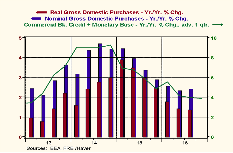 In sum, the slowdown in the growth of combined commercial bank credit and the monetary base in the past two years is primarily the result of the Fed’s failure to create enough thin-air credit to prevent the stagnation in monetary base in 2015 and the outright contraction in the monetary base so far in 2016. And I would submit to you that the significant deceleration in the growth in combined commercial bank credit and the monetary base in 2015 and 2016 is primarily responsible for the deceleration in the growth of both nominal and real Gross Domestic Purchases in these years as well.