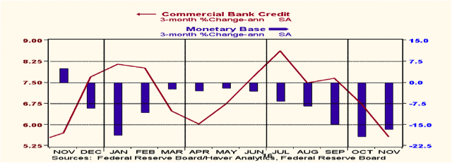 The extreme weakness in the growth in the past three months of combined commercial bank credit and the monetary is not just due to the contraction in the monetary base. As shown in Chart 4, there also has been some weakening in the growth of commercial bank credit, too. To wit, in the three months ended November 2016, the annualized growth in commercial bank credit slowed to 5.6%, the slowest growth since the 5.7% posted in the three months ended November 2015.